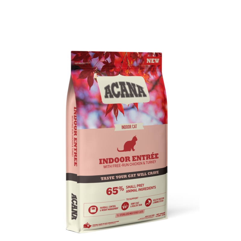 Specially crafted for your indoor cat, our ACANA™ Indoor Entrée Recipe is uniquely suited to the needs of your domesticated feline. Rich with 65% quality animal ingredients1 including free-run2 chicken and turkey, and whole herring, Indoor Entrée has the animal protein your cat needs to be their best. This nutrient-dense recipe also helps support key health benefits for your indoor cat, including weight management, hairball control, and digestive health. Nurture your indoor feline with a recipe tailored to keep them healthy and happy with ACANA Indoor Entrée!Rich with 65% quality animal ingredients1 including free-run2 chicken and turkey, and whole herring.