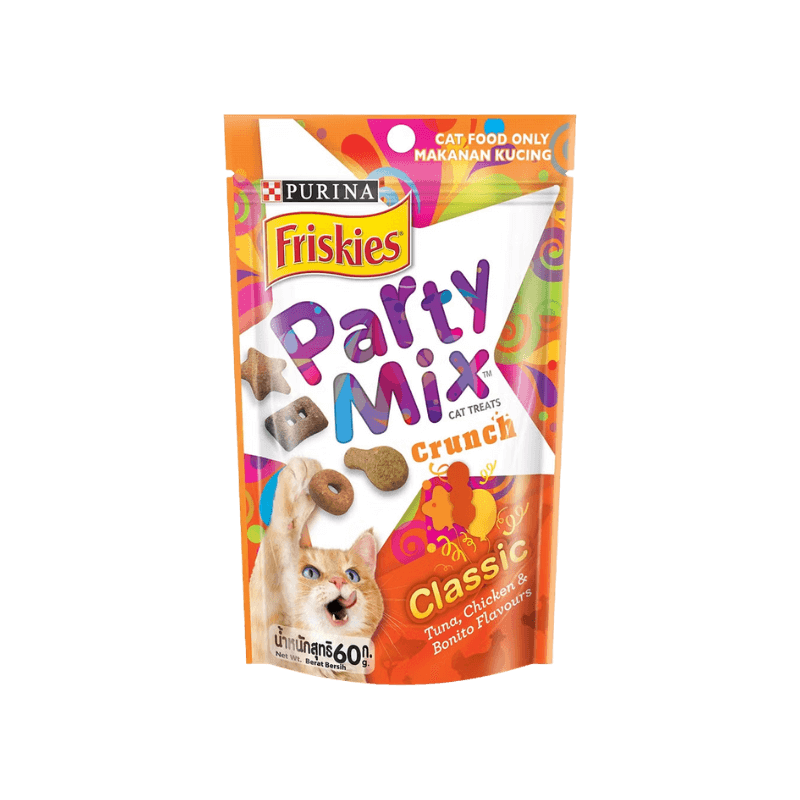 Feed your adult cat 2 treats for each 1 pound of body weight, not to exceed up to 10 treats daily as a reward or tasty snack. Purina Friskies Party Mix Original Crunch provides 100% complete and balanced nutrition for adult cats so that it will not dilute the nutritional value of your cat’s regular maintenance diet. To maintain your cat’s proper weight, reduce the amount of cat food offered proportionately to the amount of snacks you feed your cat.