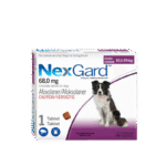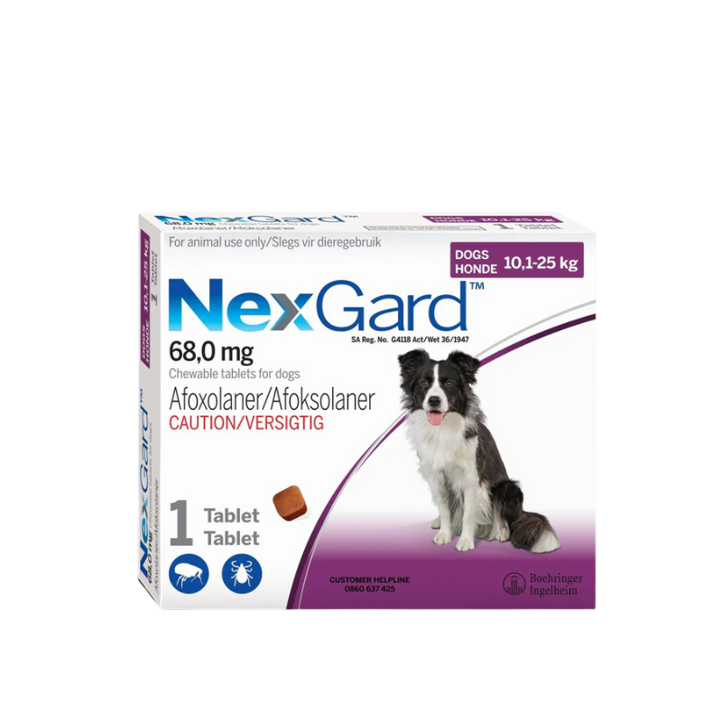 Indications: NexGard® kills adult fleas and is indicated for the treatment and prevention of flea infestations (Ctenocephalides felis), and the treatment and control of Ixodes scapularis (black-legged tick), Dermacentor variabilis (American dog tick), Amblyomma americanum (lone star tick), Rhipicephalus sanguineus (brown dog tick), and Haemaphysalis longicornis (longhorned tick) infestations in dogs and puppies 8 weeks of age and older, weighing 4 pounds of body weight or greater, for one month. NexGard® is indicated for the prevention of Borrelia burgdorferi infections as a direct result of killing Ixodes scapularis vector ticks. Dosage and Administration: NexGard® is given orally once a month, at the minimum dosage of 1.14 mg/lb (2.5 mg/kg)