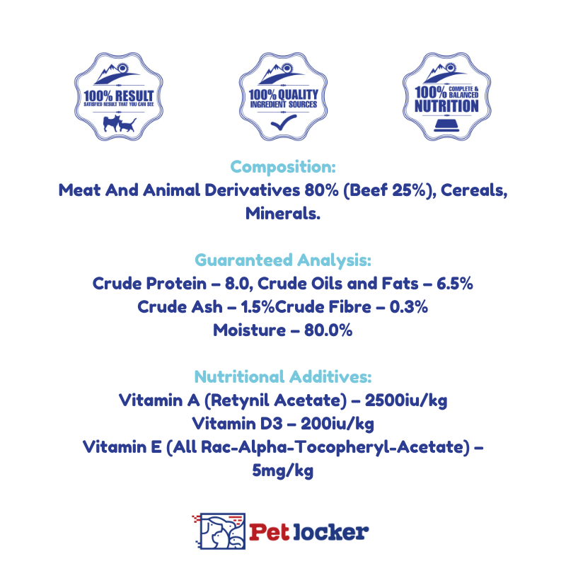 Meat And Animal Derivatives 80% (Beef 25%), Cereals, Minerals.