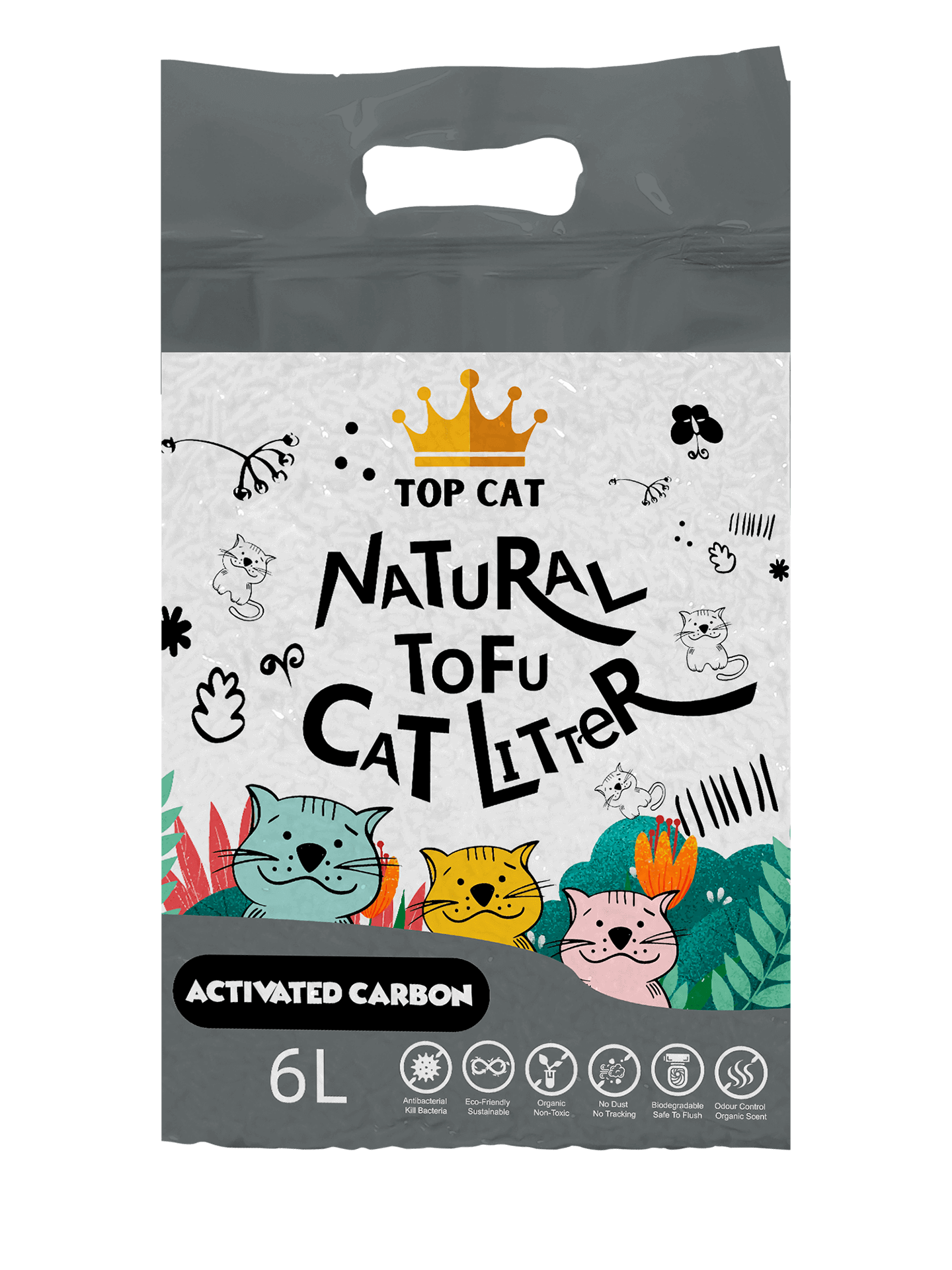 • Top Cat Tofu Cat Litter is an eco-friendly and biodegradable cat litter made from natural soybean fibers. This litter is designed to be highly absorbent, effectively controlling moisture and odor while being gentle on your cat’s paws.